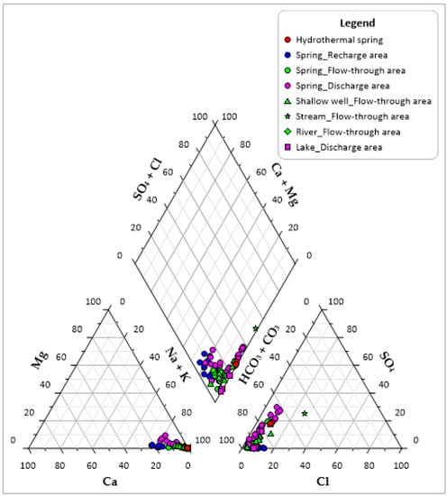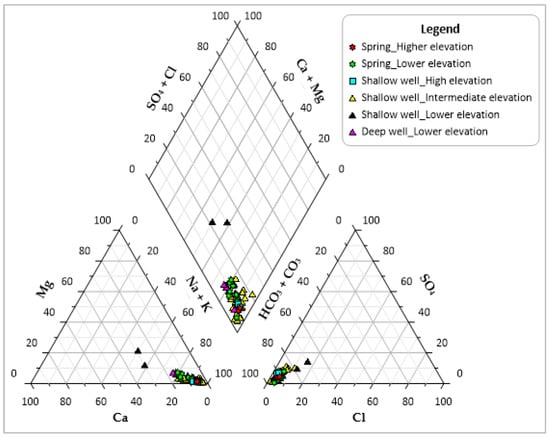 Piper diagram showing different water samples taken from springs, shallow wells, deep wells, stream, river, lakes, and water ponds.