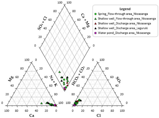 Piper diagram showing different water samples taken from springs, shallow wells, and water pond on the northern flank of Ngurdoto crater.