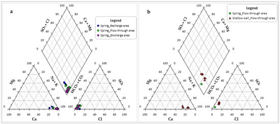 Piper diagrams showing different water samples taken from: (a) springs on the northwestern flank and (b) the spring and shallow wells on the western flank.