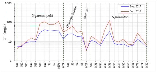 Temporal variability of F− concentrations in the groundwater samples taken in September 2017 and September 2018.