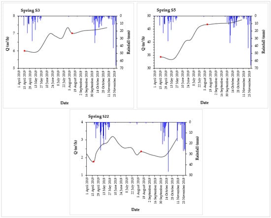 Spring discharge fluctuation at Oldonyo Sambu (S3 and S5) and at Ngarenanyuki (S22), and rainfall (Mamsa rain station for S3 and S5, and ASA Farm rain station for S22). Red dots indicate discharge values during water sampling.
