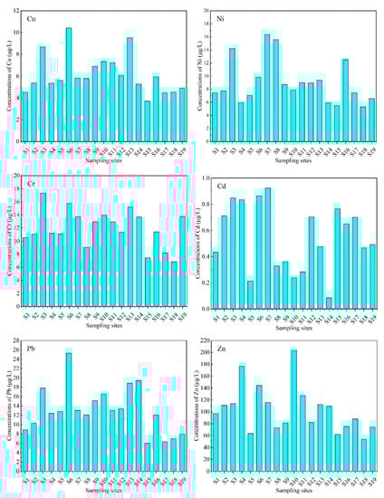 Concentrations of Cu, Ni, Cr, Cd, Pb, and Zn were detectable at all sampling sites (Figure 2), and the average levels followed the decreasing trend of Zn (103.46 ± 39.16) > Pb (13.08 ± 4.99) > Cr (11.97 ± 2.82) > Ni (9.55 ± 4.96) > Cu (6.19 ± 1.79) > Cd (0.55 ± 0.25) μg·L−1; of which the concentration of Zn was the highest in the range of 53.81~203.29 μg·L−1, and the concentration of Cd was the lowest in the range of 0.09~0.92 μg·L−1. Compared to our previous study on heavy metals in Qixing River wetland, the concentrations of heavy metals in snow cover were significantly higher than those in water (p < 0.05). It should be noted that the concentration of Pb in snow cover was higher than that of other heavy metals, except Zn, which was different from the relative ranking of Pb in water and sediment from the Qixing River wetland [10]. This difference may highlight the relative importance of snow cover, as the results from Peng et al. [32] and Xia et al. [33] have showed that approximately 92.5% of Pb in cultivated soils in China was from atmospheric deposition; thus, the concentration of pollutants in snow cover can not only directly reflect the pollution level of the regional atmospheric environment, but also build an environmental monitoring network system through the snow medium [9,34].