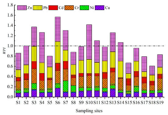 The comprehensive water pollution index (WPI) can be used to assess the magnitude of comprehensive pollution attributed to multiple heavy metals in the aquatic environment. It can also highlight the most important indicator among the target metals by evaluating the relative contribution of a single pollutant to the overall pollution. The comprehensive water pollution index (WPI) is calculated as: