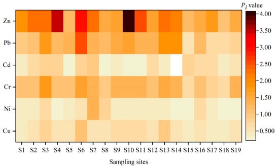 Heat map of Cu, Cr, Pb, Ni, Cd, and Zn in snow cover by single-element pollution index (Pi, Equation (1)).