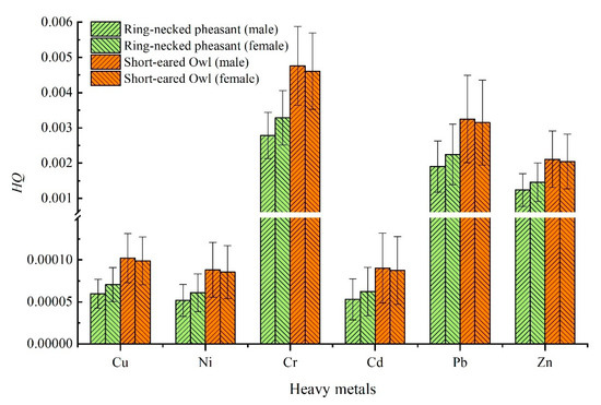 Qixing River wetland is located in a cold region, northeast China, and the water freezes from the surface downwards and even forms a “frozen bottom” in winter. The snow inside the wetland becomes the main source of drinking water for the winter resident birds, thus two representative winter resident birds, the ring-necked pheasant (Phasianus colchicus) and short-eared owl (Asio flammeus), were selected as the target species for exposure risk assessment. A body weight of 1464 g and 887 g was chosen for the male and female ring-necked pheasant, and 289 g and 318 g for the male and female short-eared owl, respectively, derived from the wildlife resources investigation results of Qixing River wetland by Tian et al. [45]. Exposure doses of Cu, Ni, Cr, Cd, Pb, and Zn per unit body weight to these two resident birds (calculated using Equation (5)) are presented in Figure S2. Selected toxicity parameters (NOAEL and LOAEL) and calculated tolerable daily intake doses (TDI; Equation (6)) are shown in Table S3. The exposure doses of all the heavy metals involved in the present study were below the corresponding TDI, indicating no deleterious effect on the population. The corresponding HQ values of heavy metal exposure to ring-necked pheasant and short-eared owl are presented in Figure 6, with the risk (defined as exposure dose > TDI) following trend of Cr > Pb > Zn > Cu > Cd > Ni. Exposure risk from snow ingestion in winter can therefore be considered insignificant, given the evidence that HQ values were three to five orders of magnitude lower than the risk threshold (HQ = 1). The species with a lower body weight will be estimated to have a higher exposure risk, as defined by Equations 3–5. In this case, the short-eared owl had a significantly elevated risk compared to the ring-necked pheasant (p < 0.05). This result was generally consistent with that of the Eurasian spoonbills (Platalea leucorodia) from the Qixing River wetland in different developmental stages in our previous study [10]. The species with a lighter body weight tends to have higher consumption rates per unit body weight, due to their relatively higher metabolism and growth rates [21], thus the estimated risk was elevated for the lighter bird relative to the larger ones.