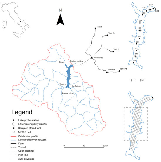 Top left: Lake Occhito position in the Italian peninsula. Main panel: Lake Occhito profile within its catchment and a schematic of the main rivers and of the irrigation network, including the storage tanks sampled in this study. Top right: Lake Occhito profile with indication of the in-situ sampling stations. Bottom right: Lake Occhito profile containing the MERIS (Medium Resolution Imaging Spectrometer) cell coverage used in this study. The dashed line delimits the area where the MOD09 AOT (Aerosol Optical Thickness) values were averaged to be used for the atmospheric corrections of MERIS data.
