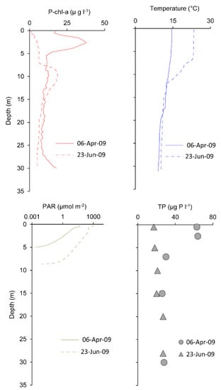 Profiles of temperature, PAR (logarithmic scale), P-chl-a and TP measured at station St6 on 6 April 2009 and 23 June 2009.