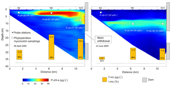 In April (Figure 3, left panel) the highest P-chl-a concentrations (≈40 µg L−1) were detected between station St5 and station St10 at about 2.5 m. At the P-chl-a peak, P. rubescens cell densities were between 26 and 91 × 106 cell L−1 with corresponding total microcystin concentrations in a range of 12.3–31.5 µg L−1. In June (Figure 3, right panel), P-chl-a peaked deeper at about 10 m and extended more continuously from the southern region of the lake (St3) to the dam (St11) with maximum P-chl-a concentrations close to 20 µg L−1. P. rubescens cell densities were between 17 and 48 × 106 cell L−1, with corresponding total microcystin concentrations in a range of 2.5–11.9 µg L−1. At the northern edge of the lake, between station St10 and St11, P-chl-a in April accumulated in the upper part of the dam due to the lower flow rate (2–3 m3 s−1), while in June, the P-chl-a pattern appears closer to the opening and more stretched by the higher water withdrawal (about 25 m3 s−1).