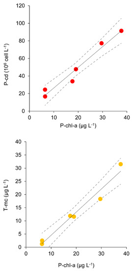A very similar relationship (r = 0.91; p-value < 0.001) was observed for intracellular microcystins whose concentrations were described as follows in Equation (7):