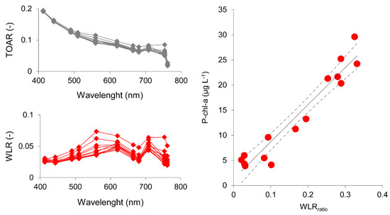 Left panels: spectral signatures of nine Lake Occhito sampling stations (St2, St3, St4, St5, St7, St8, St9, St10, and St11), before (upper panel) and after (lower panel) the atmospheric correction; TOA = Top Of Atmosphere Reflectance, WLR = Water Leaving Reflectance. Right panel: linear regression (solid line) between WLRratio computed with Equation (1) and the P. rubescens chlorophyll-a (P-chl-a) concentrations measured in the field through multiple stations fluorometric profiles in the corresponding sampling stations. Dashed lines represent the 95% confidence interval, P-chl-a: 3–29 µg L−1.