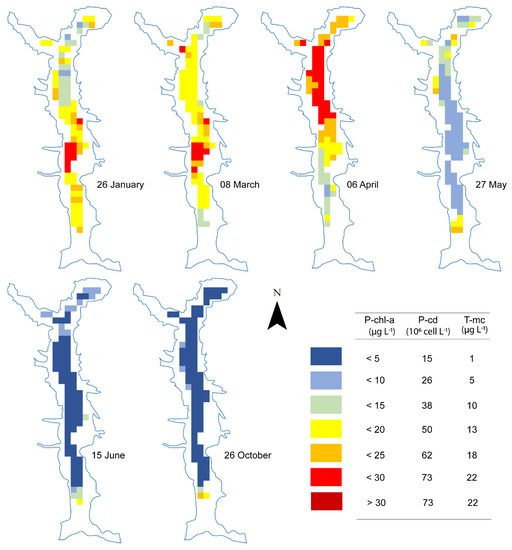 Between the end of January and the beginning of March 2009, the distribution of P-chl-a showed rather high values over the lake surface (Figure 6) with a maximum in the range of 25–30 µg L−1 in the central part of the lake surface, corresponding to P. rubescens cell density in the range of 62–63 × 106 cell L−1, and total microcystin concentrations of 18–22 µg L−1. In April, the area with the highest P-chl-a concentrations appears more concentrated in the northern part of the lake, near the dam. In May, the P-chl-a surface concentration decreased markedly to values generally below 10 µg L−1 and in June to values below 5 µg L−1 with corresponding P. rubescens cell density lower than 15 × 106 cell L−1 and total microcystin concentrations below 1 µg L−1. A very similar situation could be noticed at the end of October.