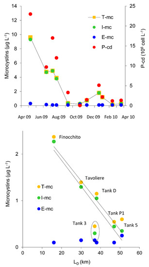 Both equations indicate a reduction of about 0.05 µg L−1 km−1 in the irrigation network. The data related to Tank 3 (circle in the lower panel of Figure 7) underline a lower contribution of intracellular microcystins compared to the other tanks located at a similar distance from the lake (e.g., Tank D, Table S1).