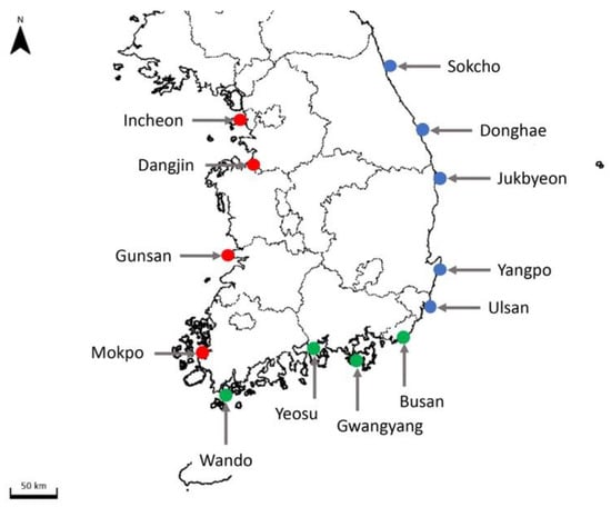 Sampling localities in this study. Locality marks were filled in different colors by region: blue—East Sea; green—Korea Strait; red—Yellow Sea.