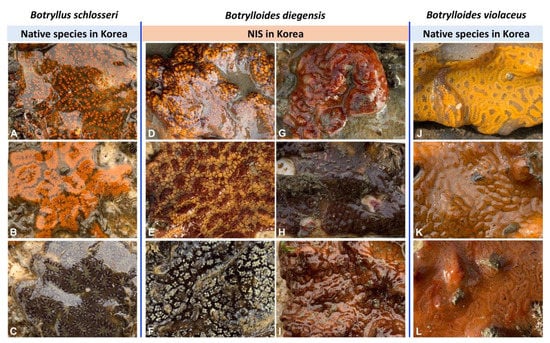 3.2. Distributions of B. diegensis and Other Similar Native Colonial Ascidians in South Korea