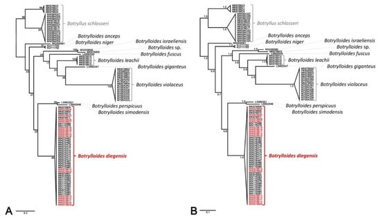 Phylogenetic trees constructed by the maximum likelihood (A) and Bayesian inference methods (B) for B. diegensis, other 10 Botrylloides species, and B. schlosseri (outgroup).