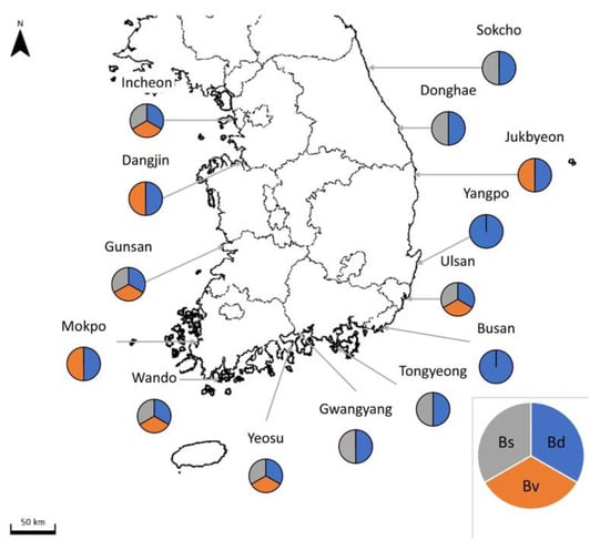Pie charts showing the presence of three Botryllids in 14 harbors of South Korea. Bd—Botrylloides diegensis; Bs—Botryllus schlosseri; Bv—Botrylloides violaceus.