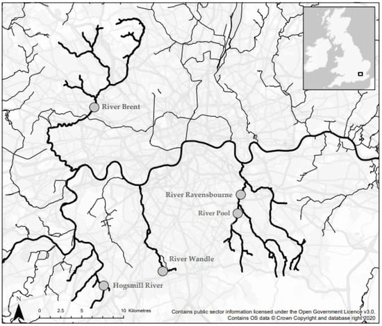 - Pike, T.; Bedford, C.; Davies, B.; Brown, D. A catchment Plan for the River Wandle. Wandle River Trust. 2014. Available online: https://www.wandletrust.org/wp-content/uploads/2014/12/Wandle_Catchment_Plan_-_Sept_2014_-_full_document.pdf (accessed on 1 May 2021).