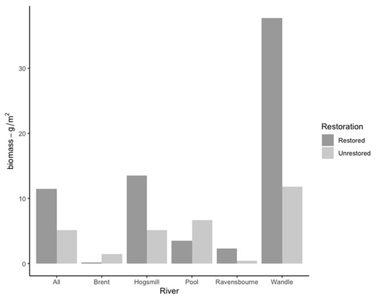 Our findings show that fish density and biomass were generally higher at restored reaches, with bullhead and brown trout driving much of the differences observed among the rivers (i.e., Wandle and Hogsmill). The River Wandle restored reach recorded the highest biomass of all sites, owing to the presence of brown trout, likely influenced by a past stocking programme [47]. In 2001, the Wandle Trust launched the ‘Trout in the Classroom’ initiative, which continued for 12 years and resulted in the establishment of reproducing and self-sustaining trout populations [48]. Higher numbers of brown trout, which are a Priority Species under the UK Post-2010 Biodiversity Framework and are intolerant of low oxygen concentrations, suggest that this species may be preferentially selecting habitats with improved conditions (e.g., water quality) created as a result of the restoration work. Similar behaviours have been observed for other species, notably stone loach and bullhead, which can respond to measures at restored reaches—for example, to the installation of artificial riffles [34]. Such behaviour may explain higher bullhead densities recorded at the Wandle and Hogsmill restored sites in this study. The European bullhead is currently listed on the International Union for Conservation of Nature (IUCN) Red List of Threatened Species [49], Annex II of the European Commission Habitats Directive [50] and Special Area of Conservation (SAC) Annex II species and are thought to be in decline. At other sites, it is possible that the reach-scale restoration activities are not proving effective in achieving desired environmental outcomes, as, for example, studies have found that stabilising banks can prevent them from migrating and, in turn, negatively impact habitat quality [51,52]. However, our findings suggest to some degree that there are clear merits to directed, reach-scale habitat creation projects.