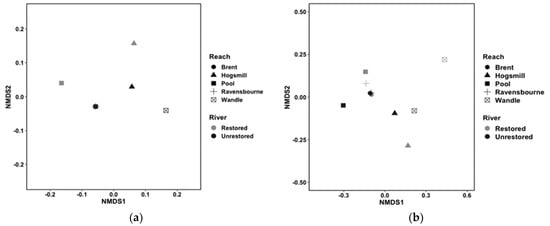 Plots of non-metric multidimensional scaling (NMDS), highlighting community clustering between rivers and reaches for (a) density and (b) biomass.
