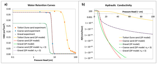 (a) Measured and fitted retention curves and (b) corresponding hydraulic conductivity functions of Tottori Dune sand, coarse sand, and gravel. The single (SP) and dual (DP) porosity models with n2 = 3 were used [12].