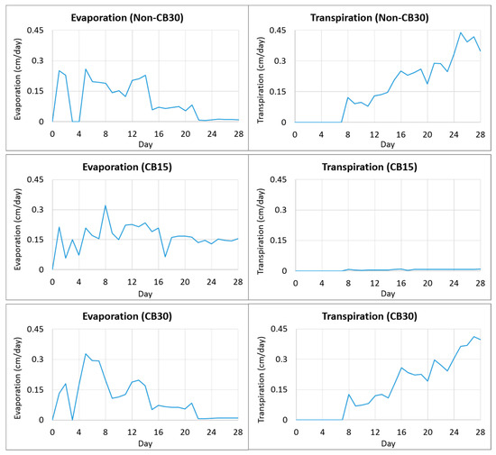 Evaporation and transpiration rates for Non-CB30 (top), CB15 (middle), and CB30 (bottom) adopted from Wongkaew et al. [12] by dividing the actual evapotranspiration rate obtained from Miyake et al. [20] for each simulation.