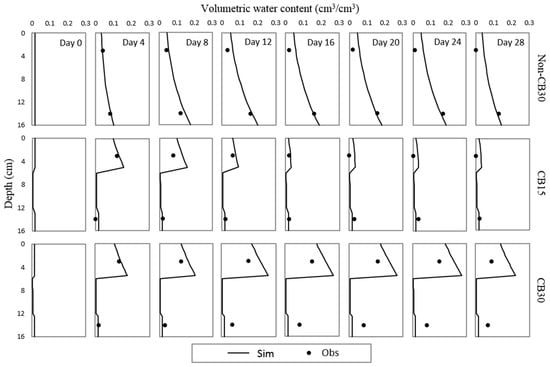 Simulated and observed volumetric soil water contents at different times (0, 4, 8, 12, 16, 20, 24, and 28 d; from left to right) and for different experimental setups (Non-CB30—A homogeneous reference column and daily irrigation of 0.30 cm (top), CB15—A column with a CB and daily irrigation of 0.15 cm (middle), and CB30—A column with a CB and daily irrigation of 0.30 cm (bottom)).