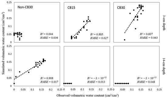 Figure 6 shows scatter plots of simulated VWCs against observed VWCs at both observation points. For the Non-CB30 setup, simulations resulted in a small correlation (R2 = 0.044) and a relatively high RMSE (=0.036) at the upper observation point. In contrast, simulations achieved a high correlation (R2 = 0.908) and a small error (RMSE = 0.017) for the lower observation point for Non-CB30. For the CB15 system, the results showed a good correlation (R2 = 0.885) with a reasonable error (RMSE = 0.027) at a depth of 3 cm and a very small error (RMSE = 0.013) at a depth of 14 cm with almost no correlation. The results for CB30 showed a large error (RMSE = 0.063) and a reasonable correlation (R2 = 0.607) at a depth of 3 cm and relatively large errors (RMSE = 0.048) with almost no correlation at a depth of 14 cm, the depth which was beneath the CB layer.