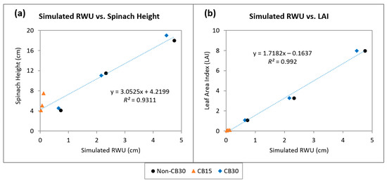 Scatter plot of cumulative RWU simulated by the model versus (a) spinach heights and (b) leaf area index obtained from Miyake et al. [20] at days 14, 21, and 28 for all experimental setups (Non-CB30, CB15, and CB30).