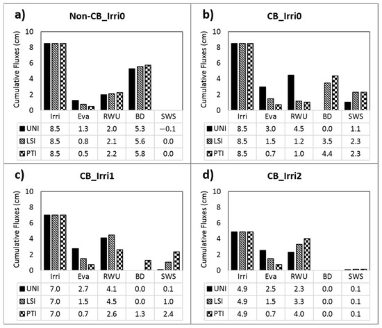 Figure 8 shows cumulative water fluxes for different irrigation scenarios simulated by the HYDRUS (2D/3D) model in a 3D domain. Simulated water balance components were found to vary depending on irrigation types (whether uniform, line-source, or plant-targeted), especially in the soil profiles with a CB. For Non-CB with Irri0 (Figure 8a), the three different irrigation types, UNI, LSI, and PTI, did not influence much simulated cumulative fluxes and produced almost no change in soil water storage (SWS). While cumulative evaporation was reduced from 1.3 cm for UNI to 0.8 cm for LSI, in which irrigation water was applied on a smaller part of the surface, both cumulative root water uptake (RWU) and cumulative bottom drainage (BD) slightly increased. When the same amount of water was directly applied around the plant in PTI, cumulative evaporation was further reduced to 0.5 cm with slight increases in RWU and BD.