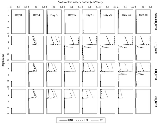 To further understand how irrigation scenarios affect soil water dynamics, temporal changes in simulated VWC profiles in the center of the simulation domain for all irrigation scenarios were plotted in Figure 9. VWCs were almost identical between different irrigation types for Non-CB_Irri0 as differences in irrigation application areas (either 6 cm × 6 cm for UNI, 3 cm × 6 cm for LSI, or 3 cm × 3 cm for PTI) produced only minimal differences in temporal changes in the VWC profiles (they were mostly overlapping as shown in this figure). The same trend was observed for cumulative fluxes (Figure 8a). On the contrary, for the soil profiles having a CB, the VWC profiles for the three irrigation types, UNI, LSI, and PTI, were visibly different from Day 4, regardless of the irrigation schedule (i.e., Irri0, Irri1, or Irri2). Figure 9 shows that the VWC at the top of the CB layer for PTI with CB_Irri0 reaches a level that would cause water to percolate through the CB system (to break the function of the CB system and to increase downward water percolation) after Day 8. The CB function was broken for LSI with CB_Irri0 from Day 12, while it was never broken for UNI with this irrigation schedule. Therefore, no bottom drainage for UNI was exhibited in Figure 8b.