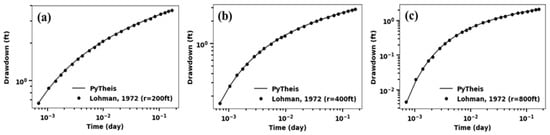 Log–log scale time-drawdown curves fitted using the PyTheis code for the Lohman (1972) datasets: (a) 200 ft data, (b) 400 ft data, and (c) 800 ft data.