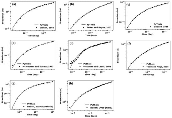 Log–log scale time-drawdown curves fitted using the PyTheis code for the literature problems: (a) Walton (1962), (b) Fetter and Rayne (2001), (c) Driscoll (1986), (d) McWhorter and Sunada (1977), (e) Viessman and Lewis (2003), (f) Todd and Maya (2005), (g) Synthetic data from Naderi (2019), and (h) field data from Naderi (2019). The data points were taken from the tables/figures reported in these publications.