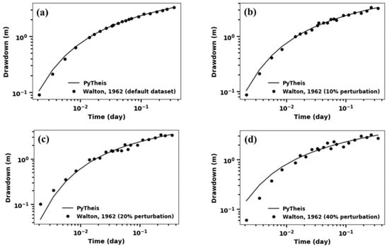 Log–log scale time-drawdown curves fitted using the PyTheis code for the perturbed Walton (1962) problems: (a) base case data, (b) ±10% perturbation, (c) ±20% perturbation, and (d) ±40% perturbation.