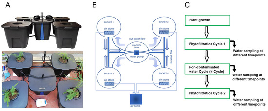 Young ferns used for phytofiltration experiments were initially grown 4 months in soil and subsequently 4 weeks in the RDWC hydroponic system (Figure S1, Figure 3A,B), which allows to control and monitor ferns growth, exposing plants to the same water pH, nutrient density and oxygenation.