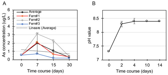 As P. vittata is able to secrete hydroxide ions (OH−) and modifies pH values when grown in soils [28], we evaluated if this could also happen when ferns are grown in water. Thus, we measured water pH at different times, 0, 2, 4, 10 and 14 days. As shown in Figure 5B water pH increases from 7.3 to 8.4 in four days without any further subsequent increase. This is consistent with previous studies [14], which showed that P. vittata grown at different nutrient concentrations is able to modify and increase the pH value above 8 in hydroponic cultures. The limited increase in the pH value and the negligible release of As, following P. vittata growth, indicate that the ferns can be reused for subsequent phytofiltration cycles.