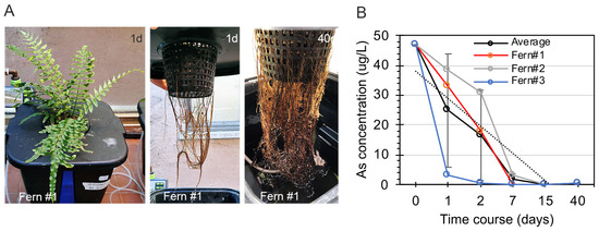 Phytofiltration experiment cycle 2. (A) Ferns from cycle 1 were placed in individual buckets filled with 15 L of naturally As-contaminated groundwater. Fern 1 is shown after one day (left panel) and the fronds and roots of Fern 1 after one day (central panel) and 40 days (right panel) on As treatment. (B) The amount of arsenic in the water at different timepoints is reported for each fern at the indicated times from one day to 40 days: Fern #1 red line; Fern #2 grey line; Fern #3 blue line. Average value ±SD is indicated by the black line.