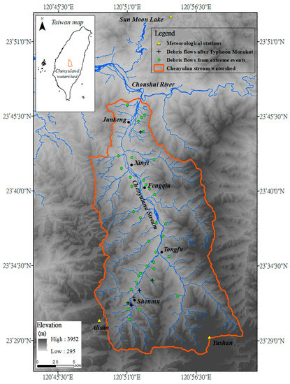 The study area was the Chenyulan watershed (from 23°24′30″–23°53′30″ N latitude and 120°42′10″–121°02′30″ E longitude) in central Taiwan, as shown in Figure 1. This area is conducive to the study of debris flows caused by extreme events owing to its weak geological characteristics (many faults accompanied by fracture zones; enormous landslides and an abundant source of rock debris [31]), abundant rainfall (the average annual rainfall in the watershed is approximately 3500 mm), as well as the occurrence of the Chi-Chi earthquake (a moment magnitude of MW 7.6, in 1999) [25,32] and many other extreme events [26,28]. Thus, many studies associated with landslides and debris flows have been conducted in this watershed [25,26,28,32].
