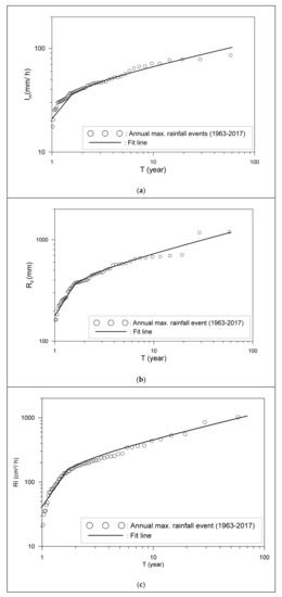 Return period (T) of rainfall index in the Chenyulan watershed. Three rainfall indexes, Im, Rd, and RI, were used. (a) Annual maximum hourly rainfall depth (Im) between 1963–2017; (b) annual maximum 24-h rainfall amount (Rd) between 1963–2017; and (c) annual maximum RI (Im × Rd) between 1963–2017.