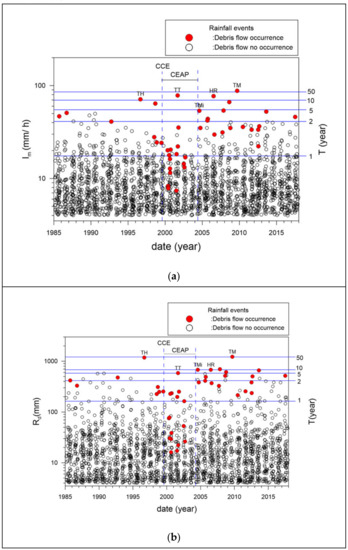 where NR is the number of rainfall events for rainfall amounts > xi. ND is the number of those rainfall events that triggered debris flows. P is then determined at various rainfall thresholds xi, from the maximum annual Im, Rd, or RI or their corresponding T values. For example, if there were eight rainfall events and all of them triggered debris flows when RI > 285 cm2/h or T > 5 years (see Figure 3c), thus, ND = NR = 8 and P = 1.