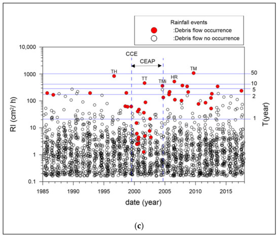 Rainfall events, using rainfall index of: (a) Im, (b) Rd, and (c) RI, and rainfall-triggered debris flow events between 1985–2017. Data points show debris flow events triggering after the five extreme rainfall events TMi, TT, HR, TH, and TM, Chi-Chi earthquake (CCE), and during the CCE-affected period (CEAP).