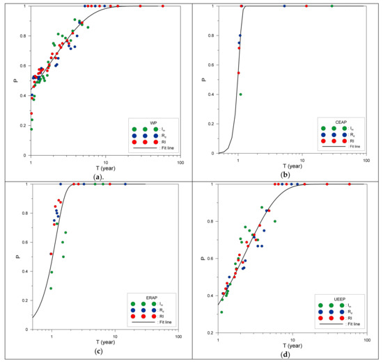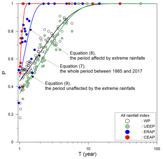Furthermore, the relationship between P and T for the whole period (WP) between 1985–2017 and the unaffected by extreme events period (UEEP) (i.e., the WP excluding CEAP and ERAP) can also be developed. The four periods (i.e., WP, CEAP, ERAP, and UEAP) and their analysis range of rainfall events are summarized and listed in Table 2. Figure 4 shows the relationships between P and T during WP, CEAP, ERAP, and UEEP. Whether using Im, Rd, or RI indices, the data describing the relationship between P and T showed a similar distribution in all periods. The P‒T relationship can be expressed in the form of a Weibull distribution, i.e.;