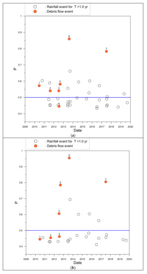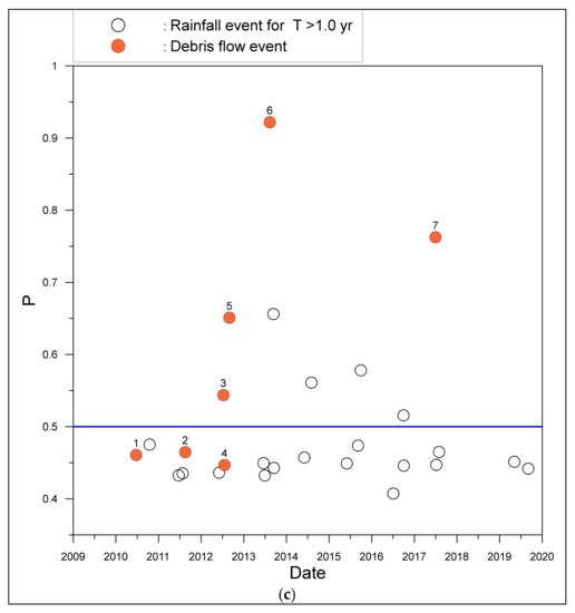 In Figure 6a, using the T of Im to evaluate P, 10 rainfall events that did not trigger debris flows were predicted with P ≥ 0.5, although most of the debris flow events (i.e., six of seven) were reasonably predicted by P values > 0.5. In Figure 6b,c, using the return periods of Rd and RI to evaluate P, respectively, only four of the seven debris flow events were predicted with occurrence probabilities of P ≥ 0.5. The occurrence probability P for the four rainfall events that did not trigger debris flows was overestimated with values of P ≥ 0.5.