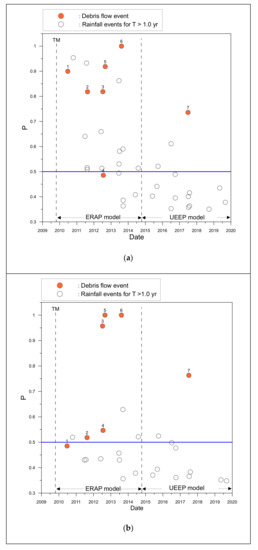 The model for the WP mainly presents the long-term characteristics for P and is unable to respond to the occurrence of a debris flow that is affected or unaffected by extreme events. Thus, the predicted P for the period of 3 years after Typhoon Morakot was determined using the ERAP model (Equation (8)), and the predicted P after the ERAP was determined using the UEEP model (Equation (9)). As shown in Figure 7, three rainfall indexes (Im, Rd, and RI) were used to evaluate the T values that were associated with the ERAP and UEEP models.