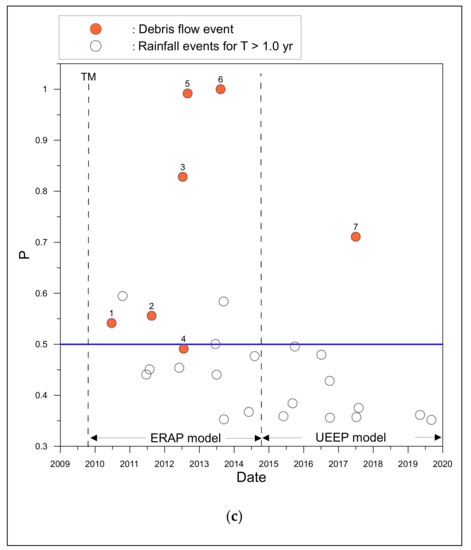 Probability of debris flow occurrence (P) evaluated using the model for the extreme rainfall-affected period (ERAP) within the 3 years after Typhoon Morakot (Equation (8)), and the model for the unaffected by extreme events period (UEEP) after the ERAP (Equation (9)). The rainfall return period (T in Equation (8) or ((9)) was determined using three rainfall indexes: Im, Rd, or RI. (a) T determined by Im: six debris flows were predicted within twenty rainfall events when P ≥ 0.5 and one debris flow events with P ≥ 0.5; (b) T determined by Rd: six debris flows were predicted within ten rainfall events when P ≥ 0.5 and one debris flow events within P ≥ 0.5; and (c) T determined by RI: Six debris flows were predicted within a total of eight rainfall events when P ≥ 0.5, and one debris flow event when P ≥ 0.5.