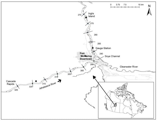 Study site of the Lower Athabasca River. The km values are marked along the model domain from Cascade Rapids to Inglis Island.