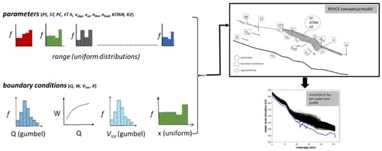 A detailed description of how these parameters and boundary conditions are incorporated into the RIVICE programme is given in the software manual (http://giws.usask.ca/rivice/Manual/RIVICE_Manual_2013-01-11.pdf) and a recent publication []. Most of these inputs were calibrated using historical ice-jam events that occurred along the model domain. The detailed calibration and validation of RIVICE along the model domain is documented in a previous study by Lindenschmidt []. The calibrated RIVICE model is then placed into the MOCA framework to generate hundreds of ice-jam scenarios. MOCA was carried out using the Parameter Estimation Program (PEST) []. Since MOCA requires a different set of parameters and boundary conditions for each simulation, the values were extracted randomly from uniform or extreme value probability density functions. A uniform pdf was used for all the parameter values and the toe of the ice-jam location boundary condition, while the Gumbel distribution was used for the flow discharge and inflowing volume of ice (Figure 2). Available maximum flows during spring ice-cover breakup were selected to produce an extreme flow frequency distribution to extract random values for the MOCA simulations. The calibrated RIVICE model in the MOCA framework was initially run using an assumed value of inflowing ice distribution. The distribution was adjusted until the observed stage-frequency distribution matched the observed stage-frequency for ice jams at the Athabasca River gauge downstream of the TFM. After each MOCA simulation, the simulated stage-frequency distribution was compared with the observed stage-frequency distribution. If they did not coincide with one another, the corresponding ice distribution was adjusted and the MOCA was repeated. The process was repeated until agreement was attained between the two stage-frequency distributions. Once an ice distribution was calibrated, additional sets of MOCA runs were carried out to create an envelope of the ice distributions. Once all the model parameters and boundary conditions were randomly selected, a total of 379 ice-jam scenarios were simulated to estimate flood risk along the Athabasca River at Fort McMurray.