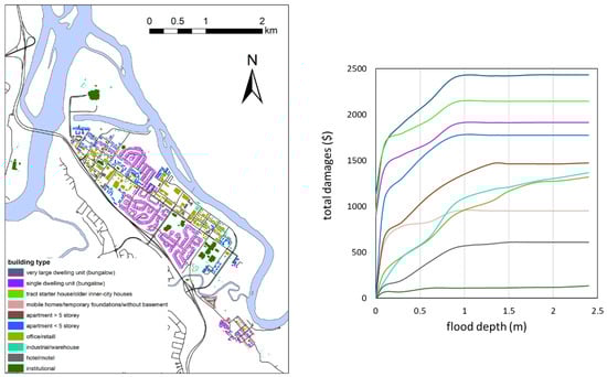 Distribution of different types of buildings (left panel) and depth-damage relationships for structure and content of various types of buildings (right panel) at the TFM.