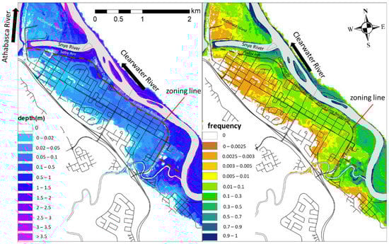 Figure 4 presents the flood intensity maps and zoning line for the TFM. Flood intensity maps demonstrate the average flood depth and extent, and the frequency of flooding along the TFM. The frequency of flooding indicates the probable vulnerable areas of the TFM, calculated as the total number of times the areas were flooded divided by the total number of the ice-jam simulations. These maps were extracted from a recent publication by Das and Lindenschmidt [].