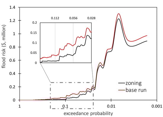 Flood risk of the base run (no zoning) scenario was established with the presence of all the buildings under a certain flood depth, while the no-development zoning scenario was developed by removing all the buildings that exist in the zoned area. A detailed analysis of the exceedance probability and flood risk of each simulated flood for the base run and no development zoning scenarios is presented in Figure 5. The result shows that zoning could substantially reduce the total flood risk for high-frequency flood events, an almost 50% reduction in flood risk for the events with exceedance probability from 0.028 (1:35 year) to 0.2 (1:5 year). This is due to the fact that fewer extreme flood events, which are highly probable in the zoned area, cause excessive damages to the existing buildings. Moreover, more extreme flooding can still inundate the area beyond the zoned area and result in high damages to buildings in the TFM. However, zoning is still effective to reduce a certain level of flood risk for more extreme ice-jam flood events.
