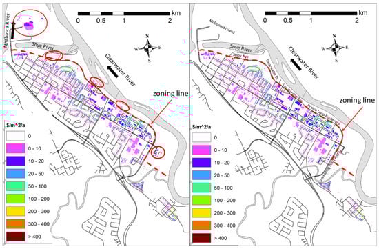 Annual flood risk maps and total EADs for the zoned (right panel) and no-zoning scenarios (left panel), the red circles indicates the properties under a specific flood risk in the zoning area. (The risk map was adopted from Das and Lindenschmidt, 2021b (used with permission) and modified here to assess zoning regulation).